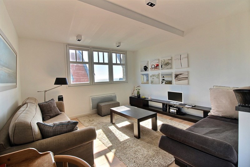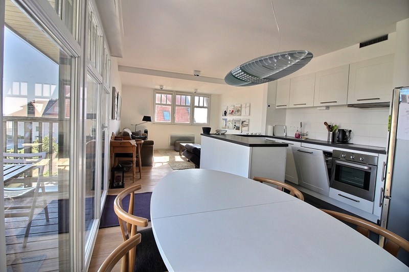 Salon séjour avec cuisine équipée. Terrasse avec salon de jardin. Belle décoration.
