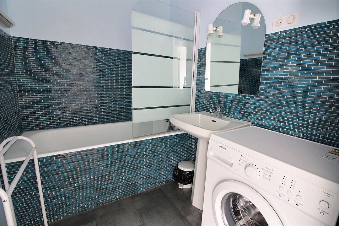 Salle de bains avec machine à laver et WC séparé.