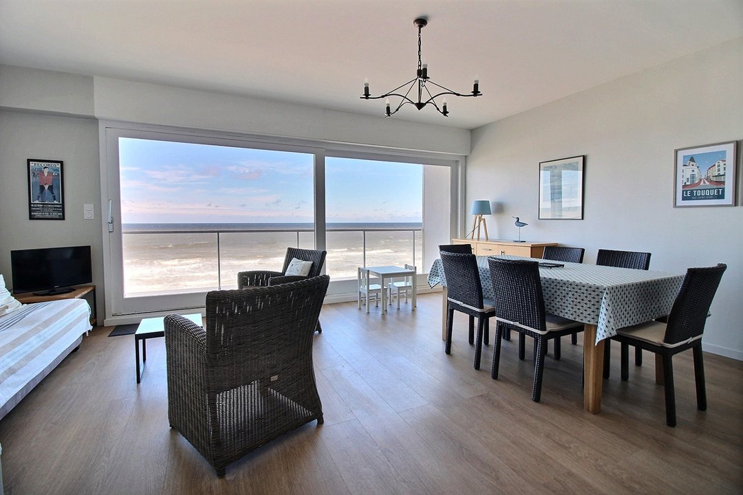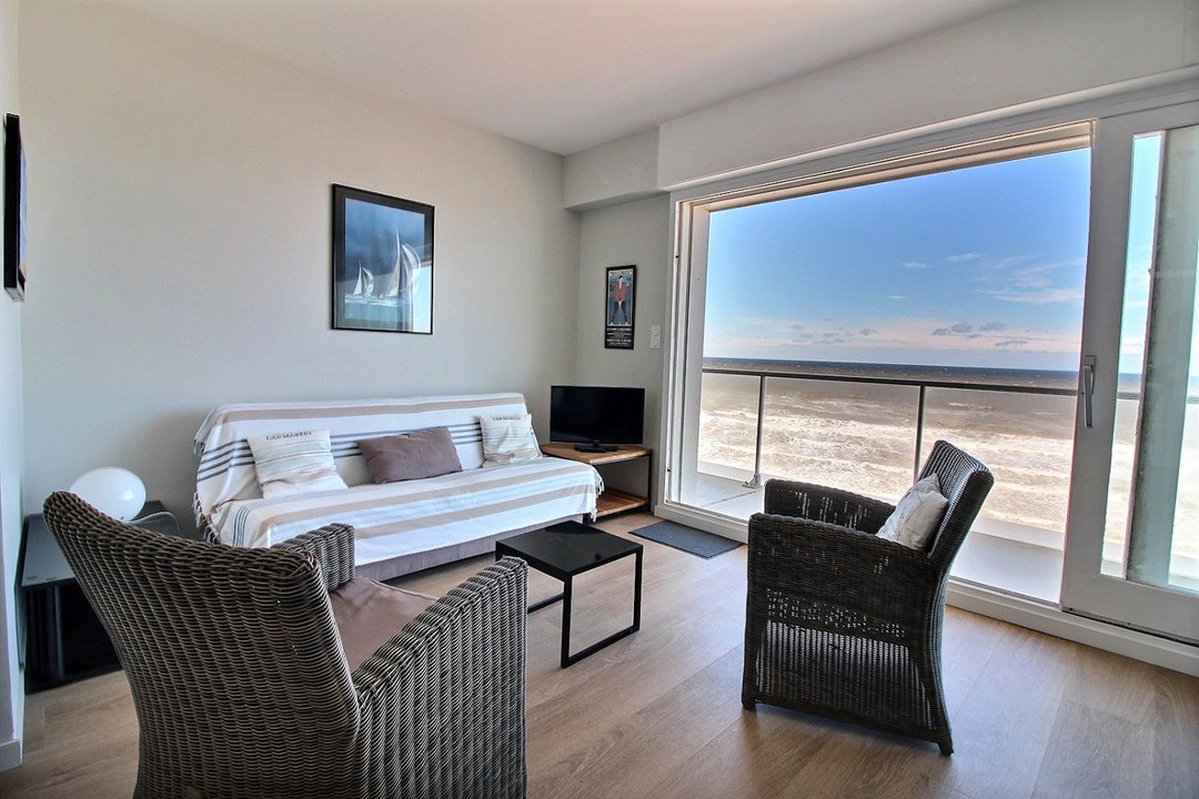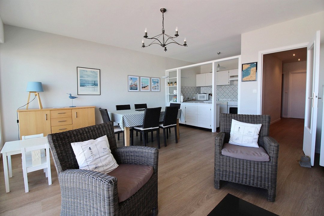 Salon/séjour avec balcon vue mer. Cuisine équipée.