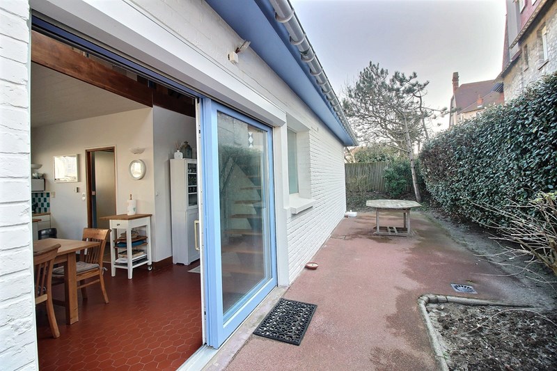 Terrasse avec salon de jardin. Garage non utilisable, possibilité de garer le véhicule dans l'allée.