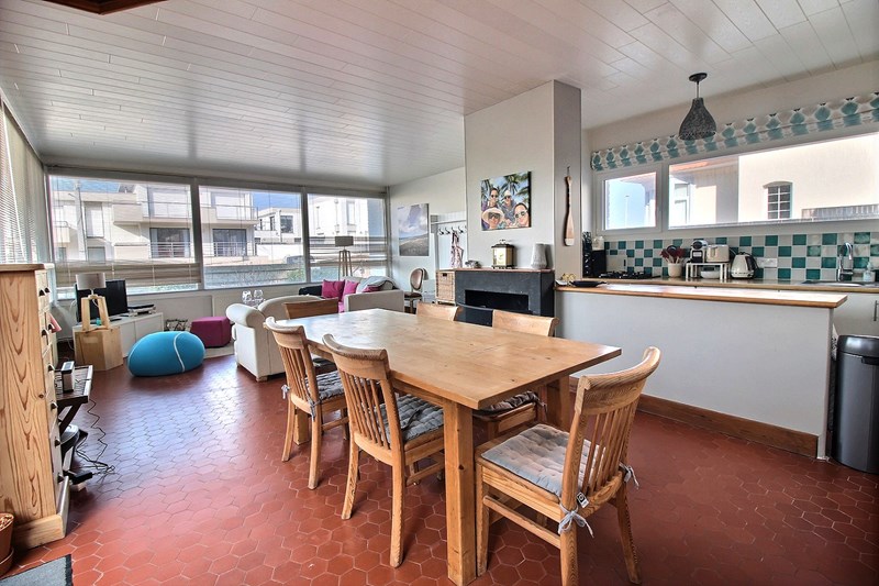 Salon / salle à manger avec cuisine ouverte équipée.