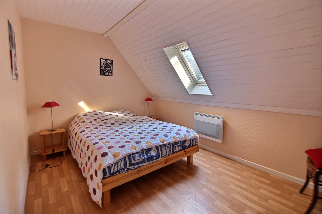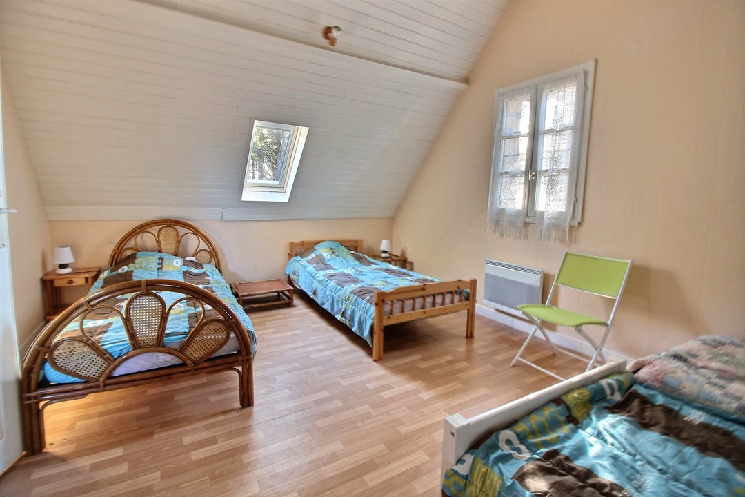 A l'étage : une 1ère chambre avec 4 lits simple en 90, une 2nde avec lit double en 140, une 3ème avec lit double en 140 et un point d'eau avec lavabo.