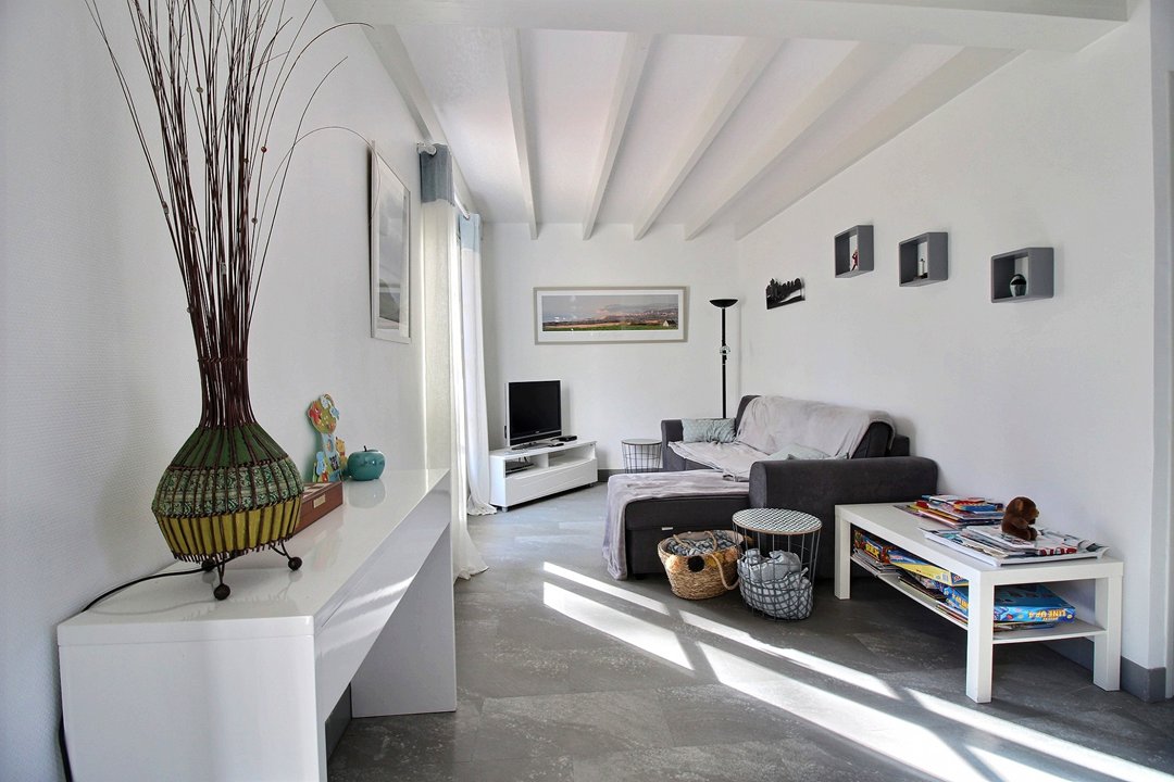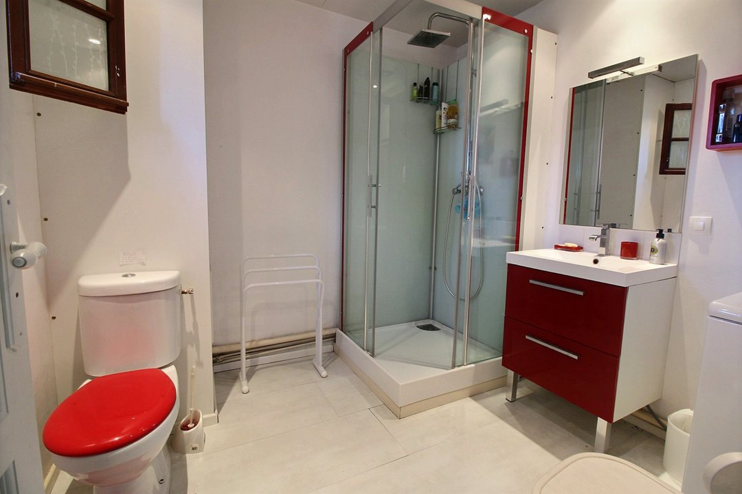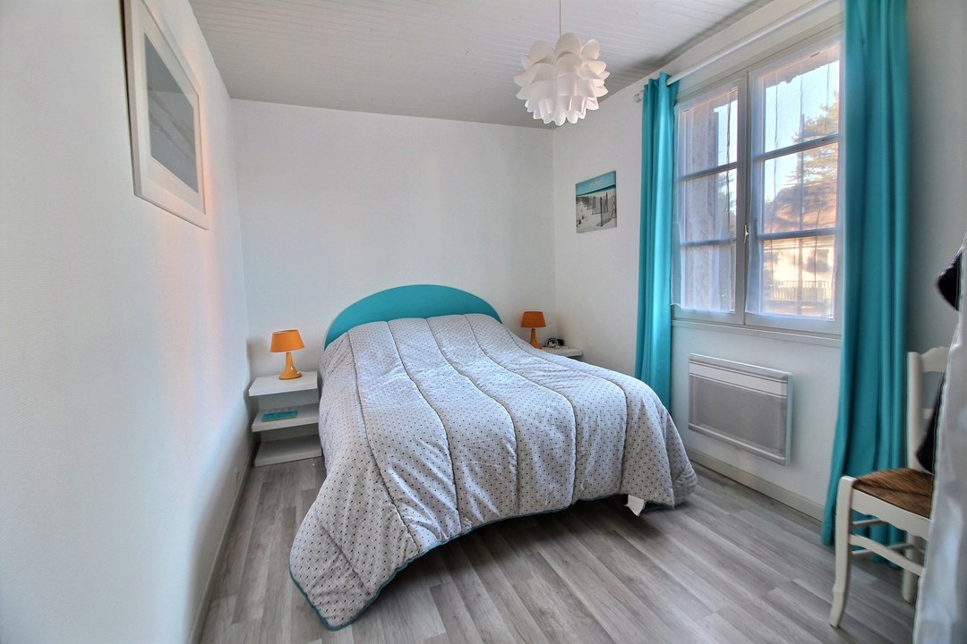 Au rez-de-chaussée : salon-séjour, cuisine ouverte, salle d'eau douche avec WC, 1 chambre avec lit double en 140.