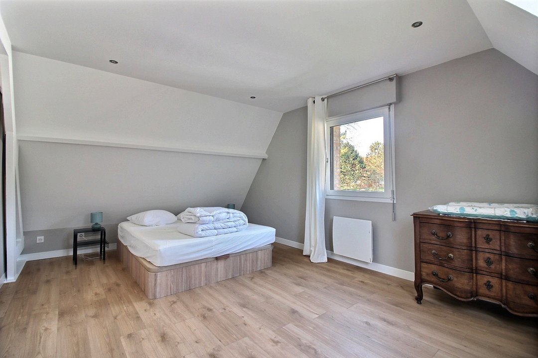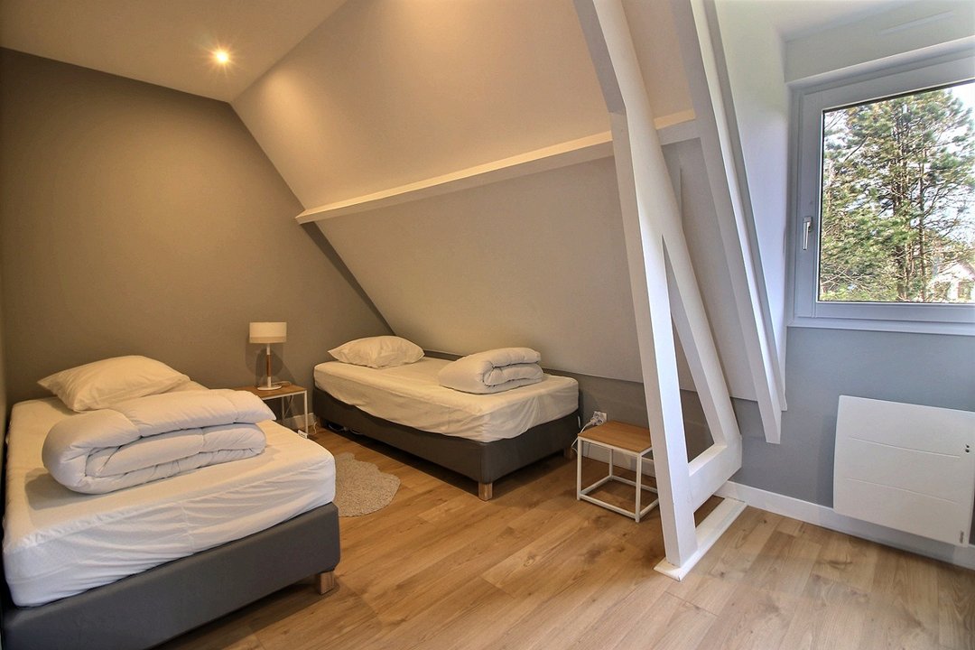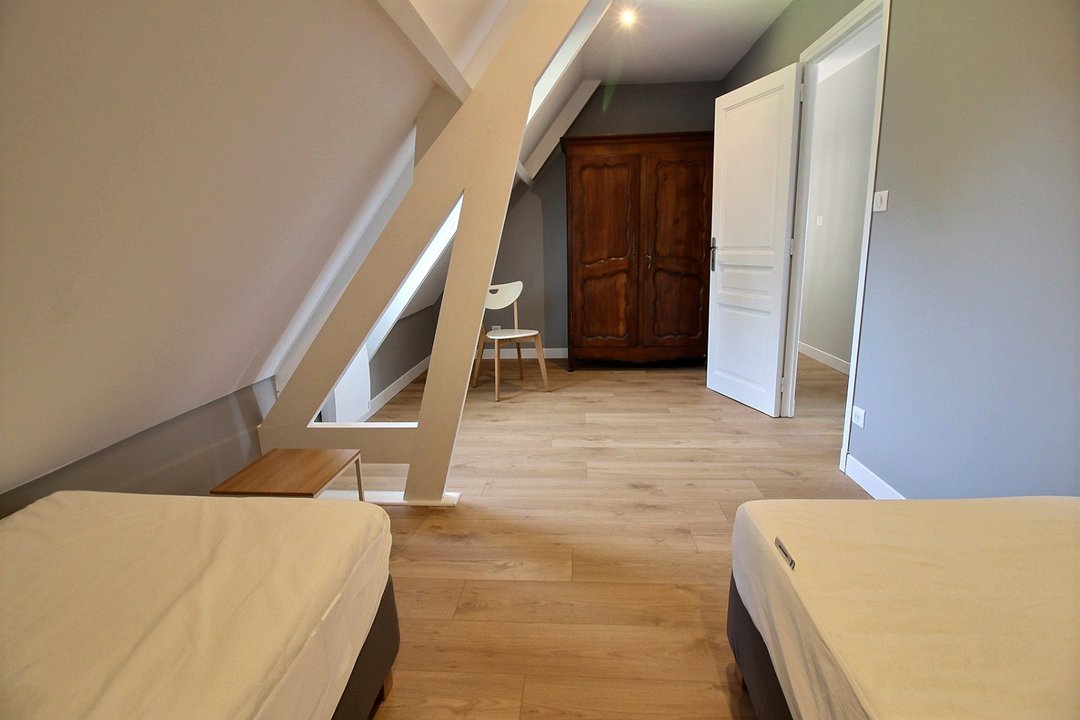 A l'étage, une chambre avec lit double en 160 et 2 chambres avec 2 lits simples en 80, salle de bains, un WC et une mezzanine.