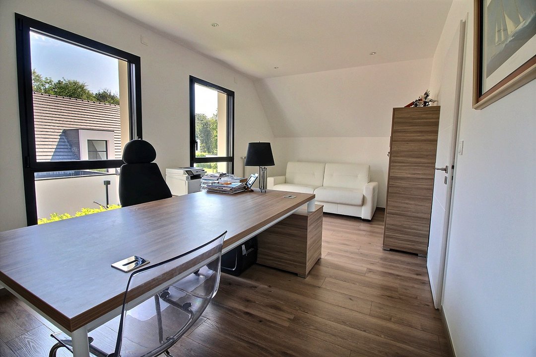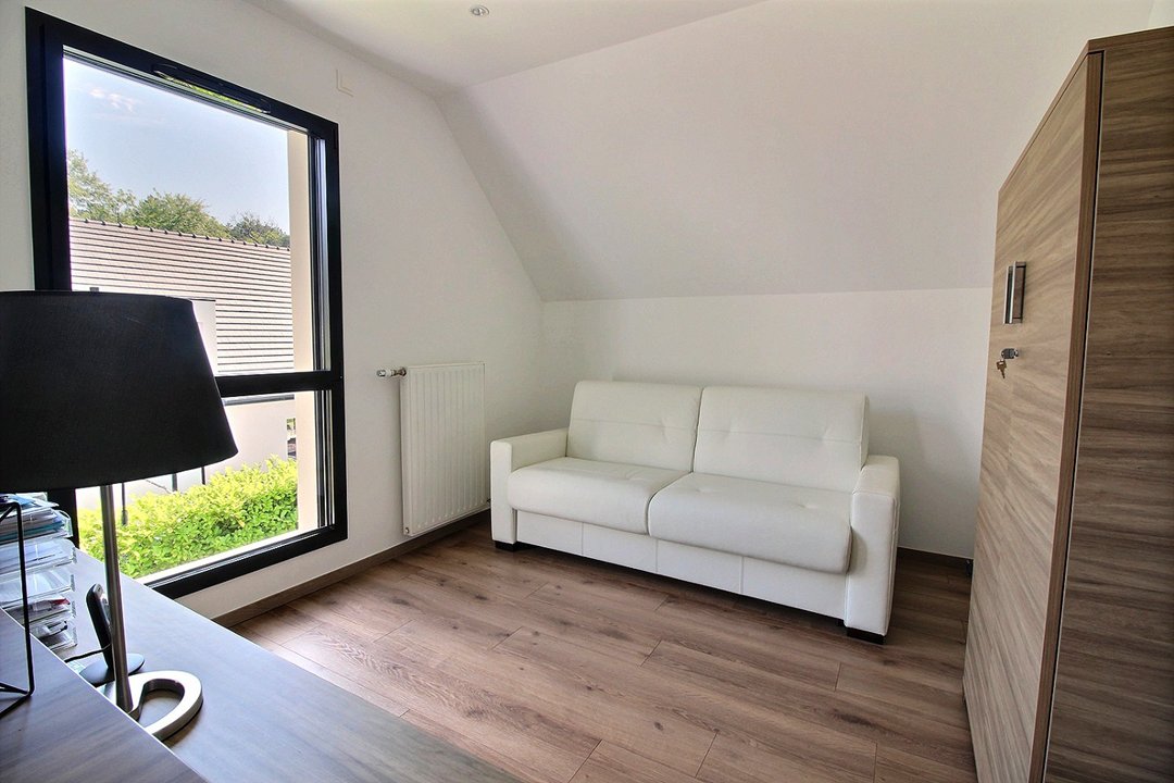 À l'étage : un bureau avec canapé convertible d'appoint, une salle de bains, wc et une chambre avec lit simple et tiroir en 90.
