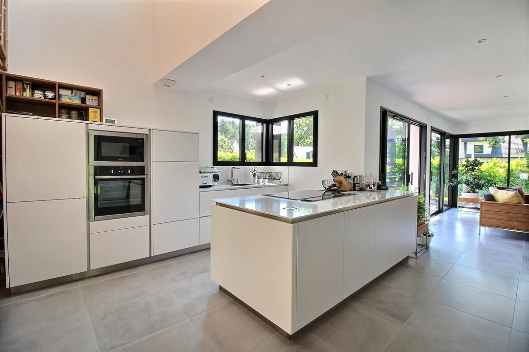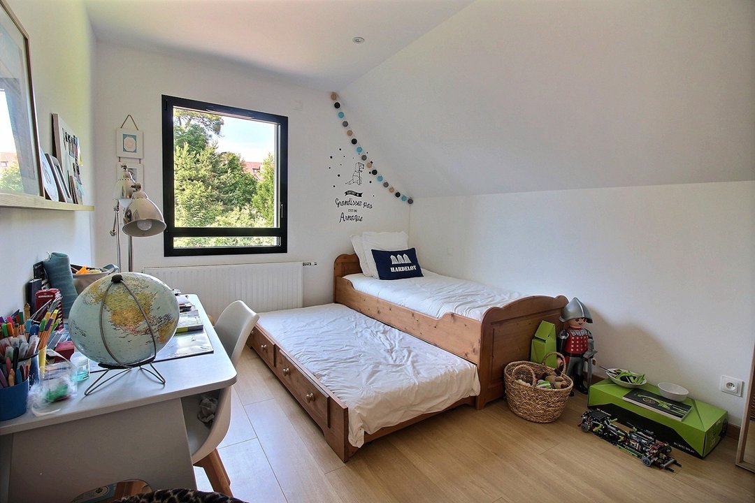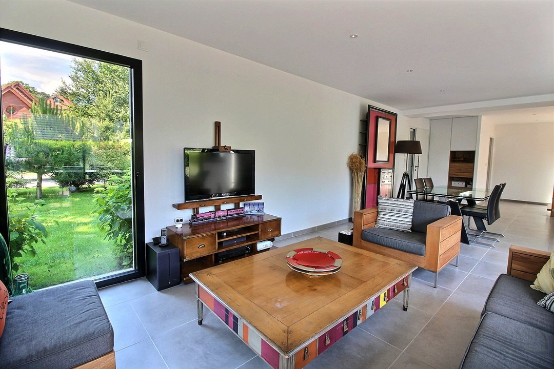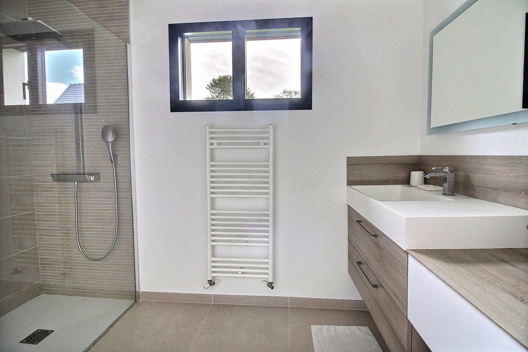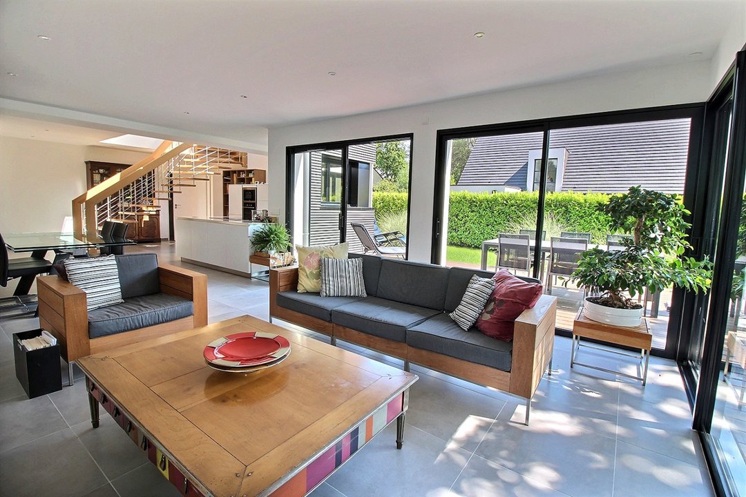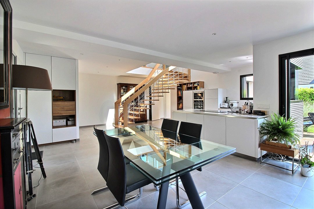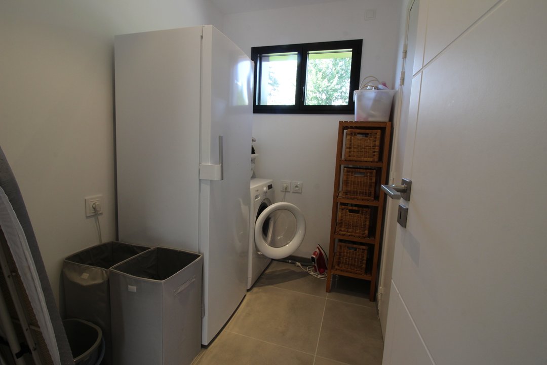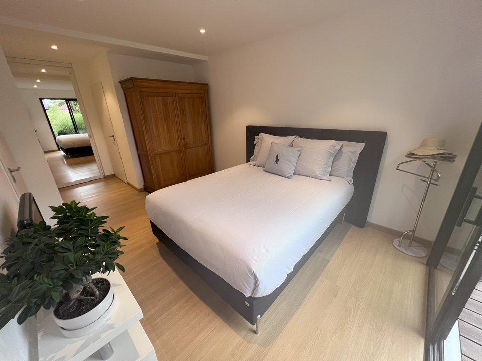 Au rez-de-chaussée : salon-séjour, cuisine ouverte sur le séjour, une chambre avec lit double en 160 et salle d'eau, wc et buanderie.