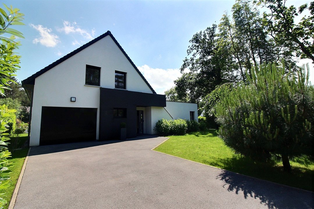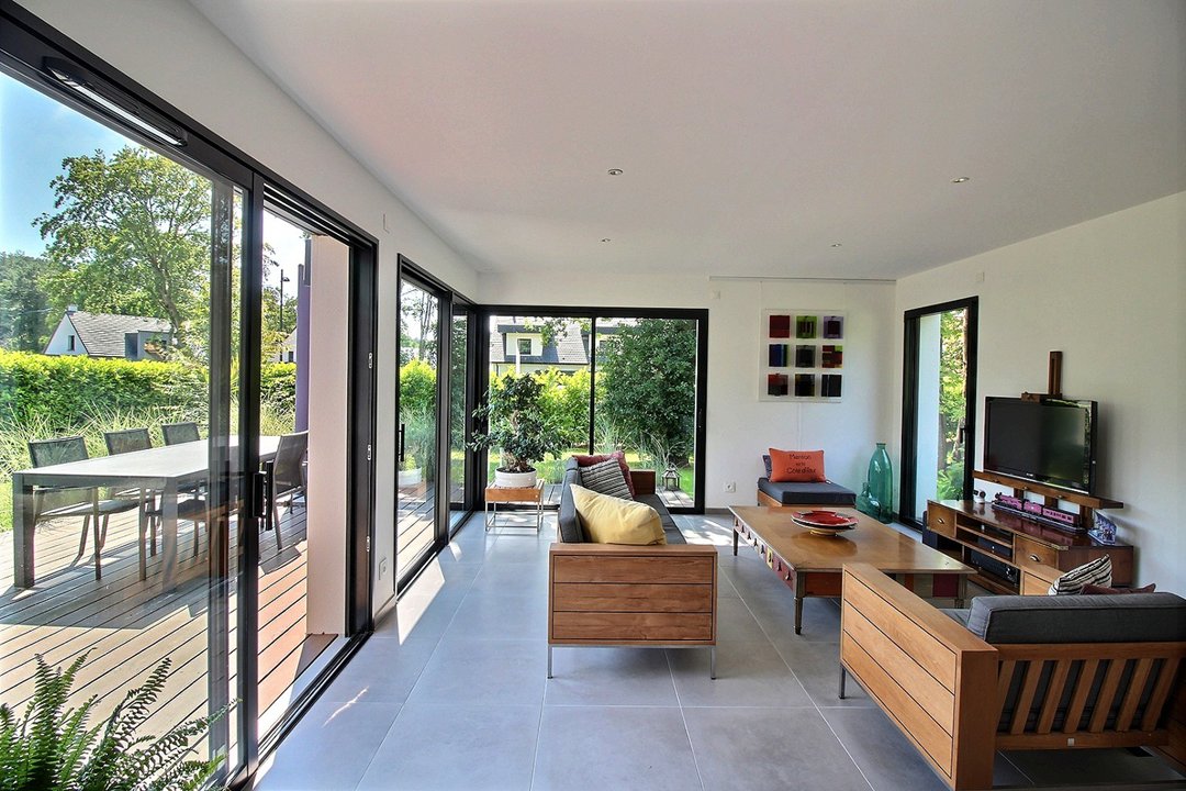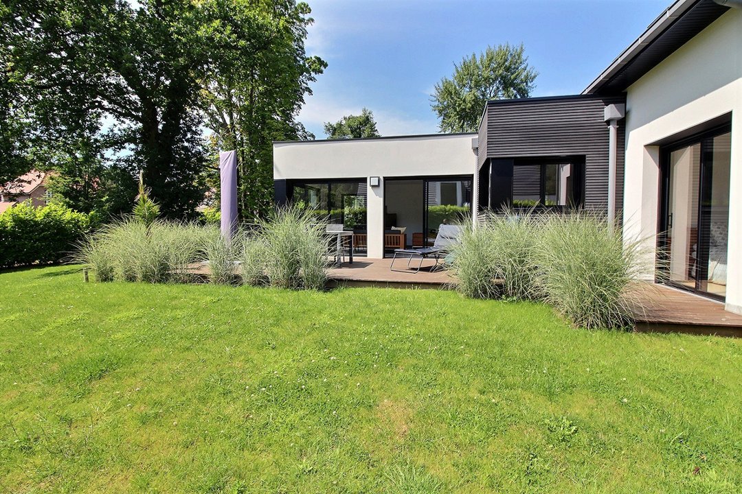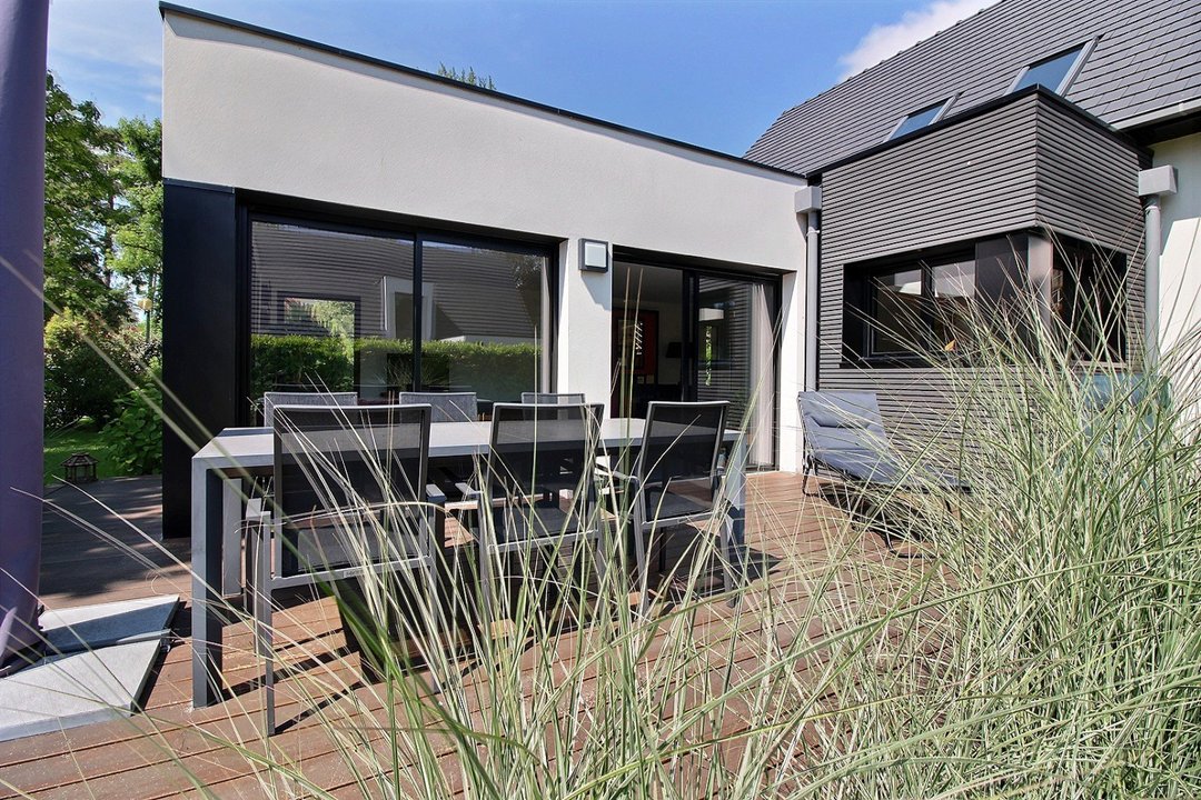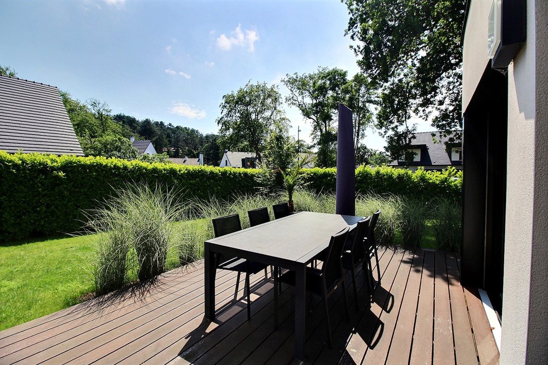 Terrasse et beau jardin arboré.