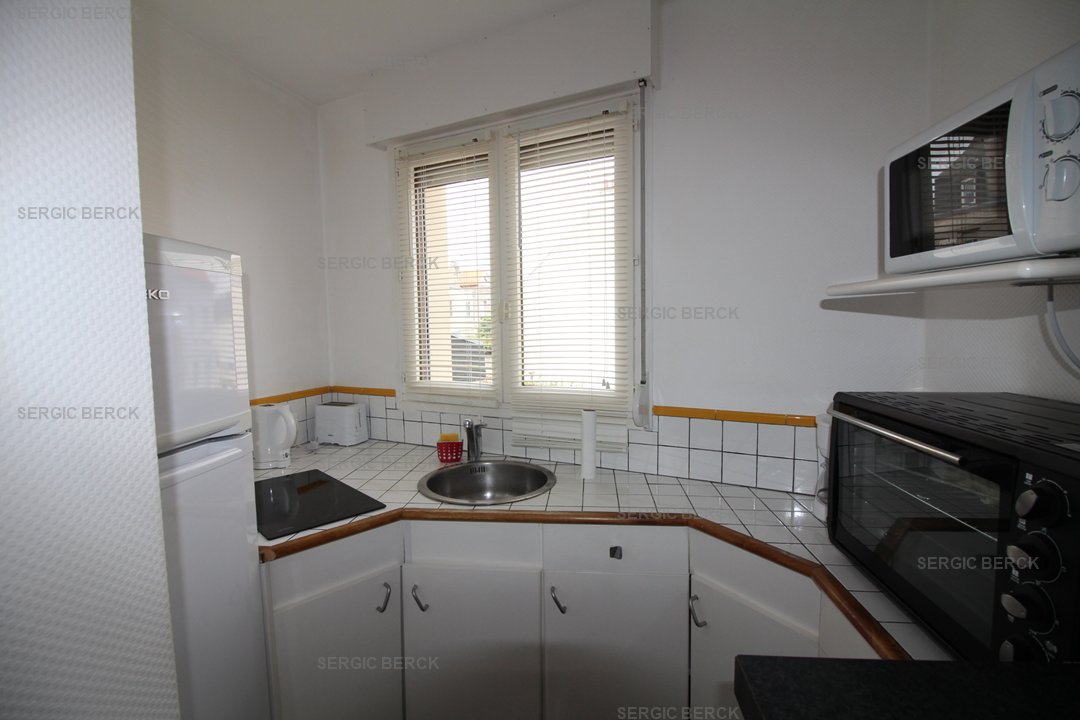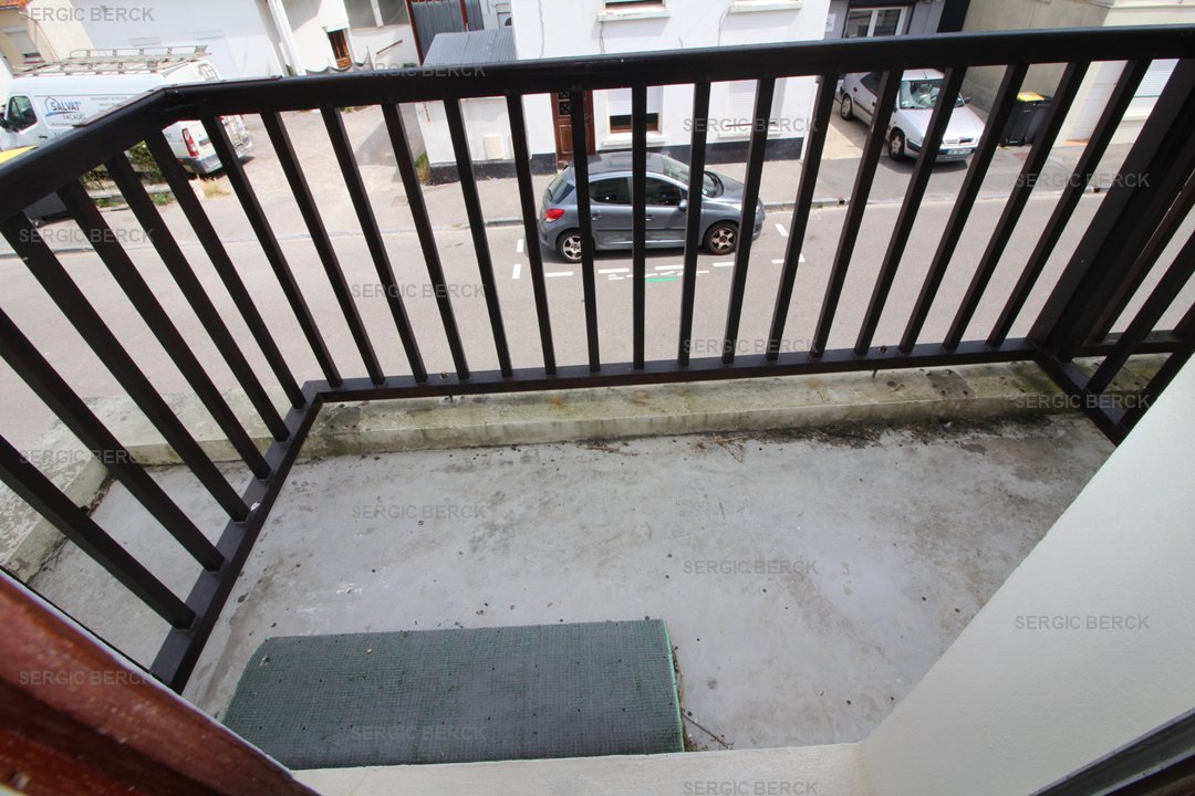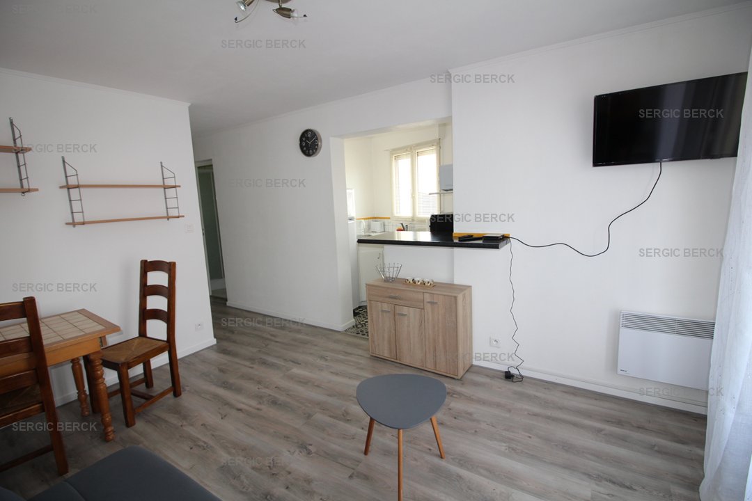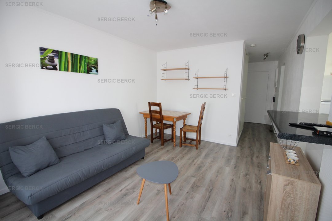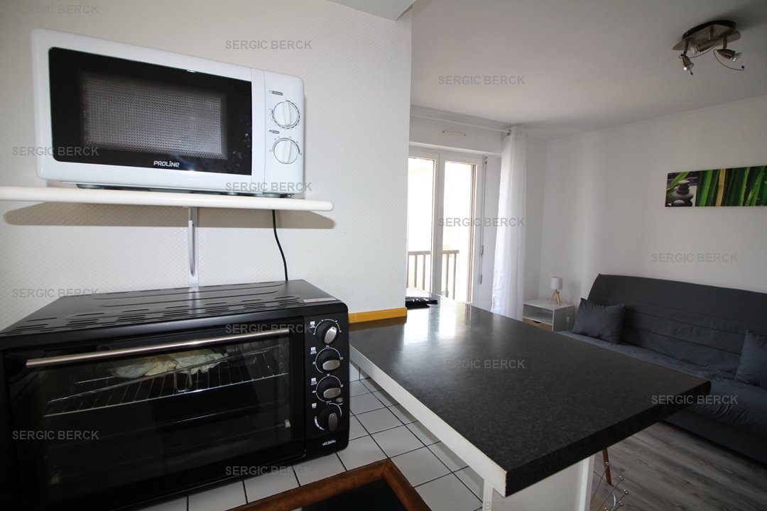Studio pour 2 personnes au 1er étage d'un immeuble sans ascenseur à proximité du centre et de la plage avec emplacement parking privé, qui comprend un séjour avec un clic clac 2 personnes, un balcon, coin cuisine équipé, une salle d'eau avec douche, wc. wifi