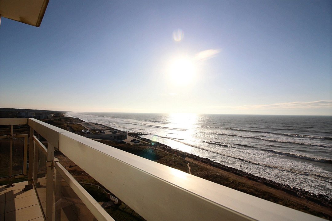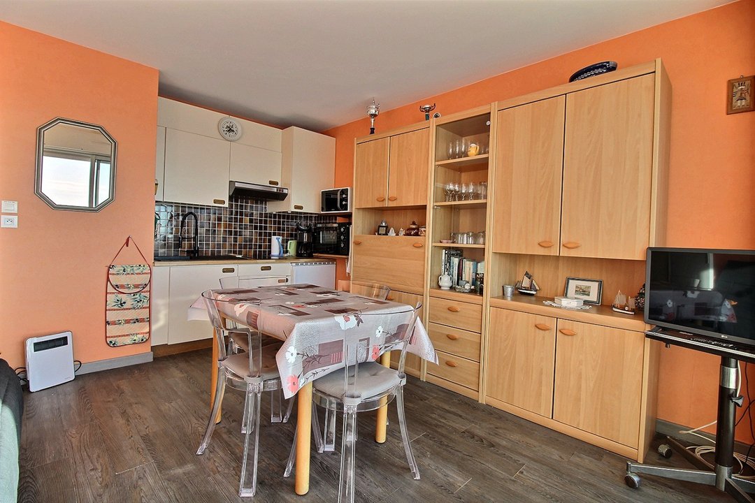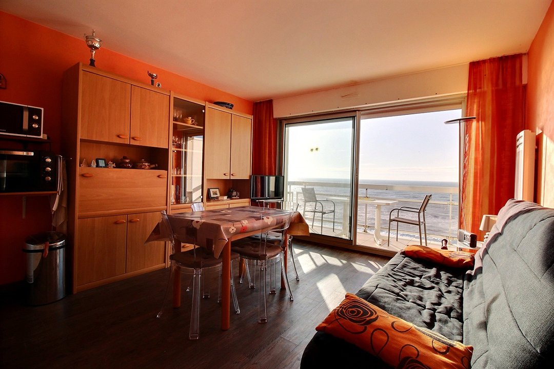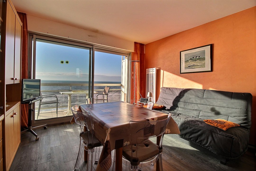 Séjour avec cuisine ouverte, balcon vue mer avec salon de jardin.