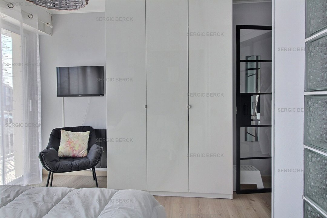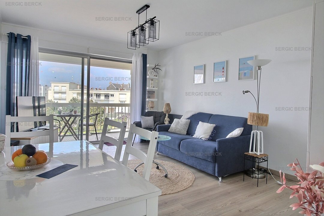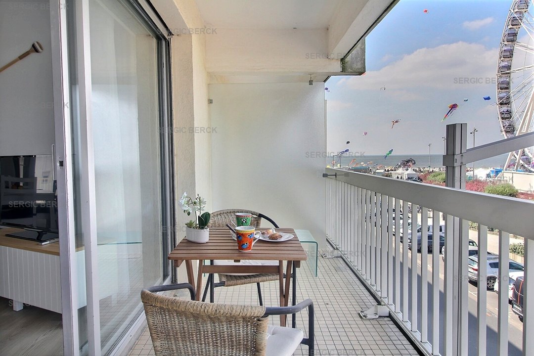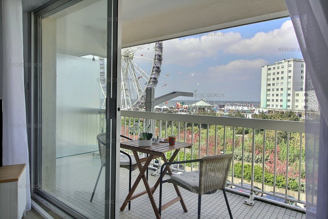 Entrée, cuisine équipée, chambre (lit double) avec balcon plein sud, wc indépendant, salle de bain, séjour avec balcon vue mer.