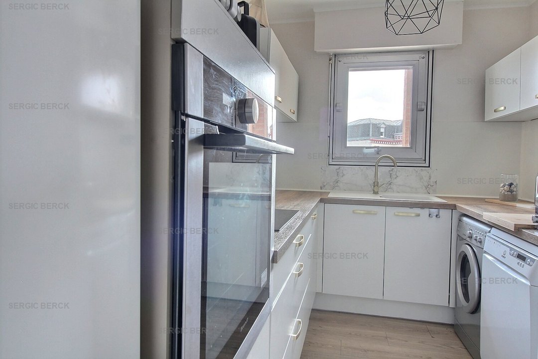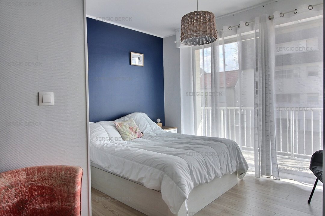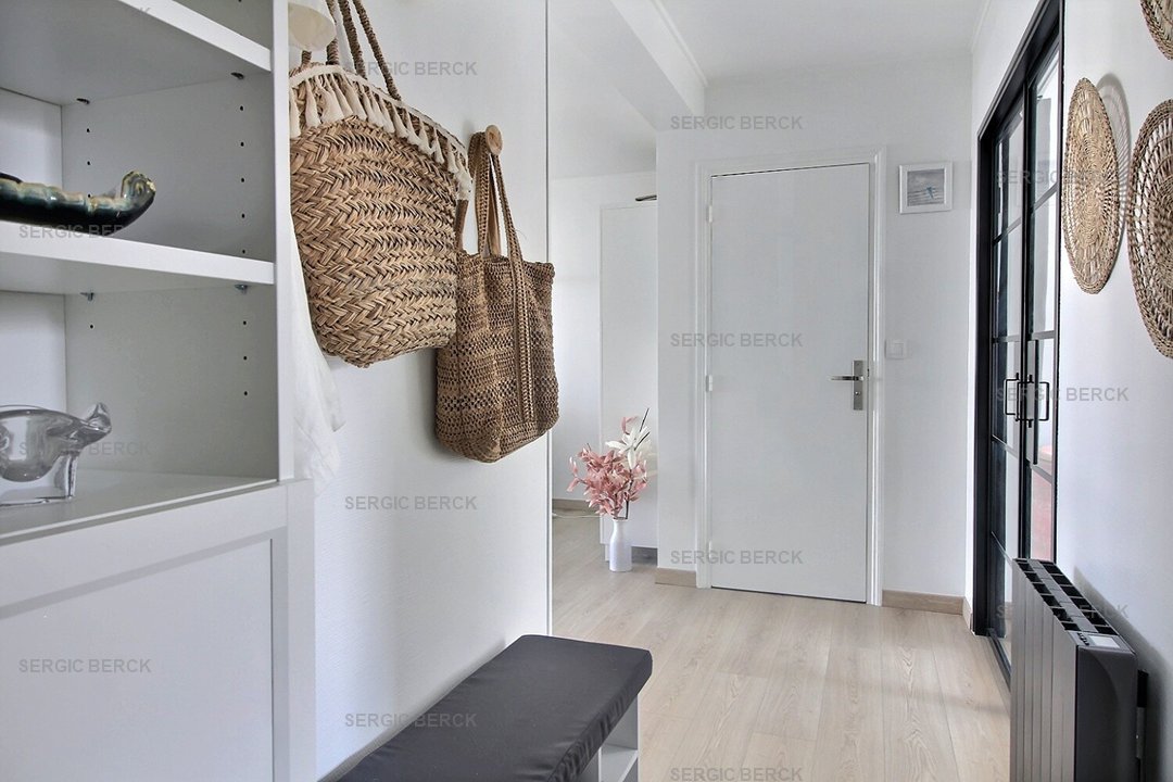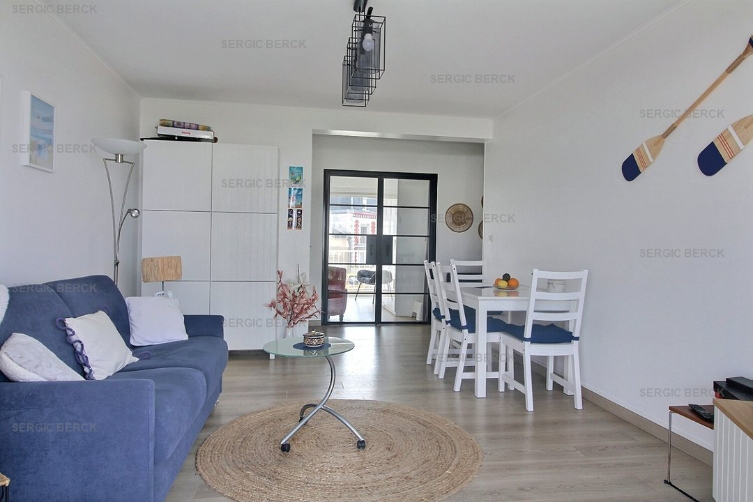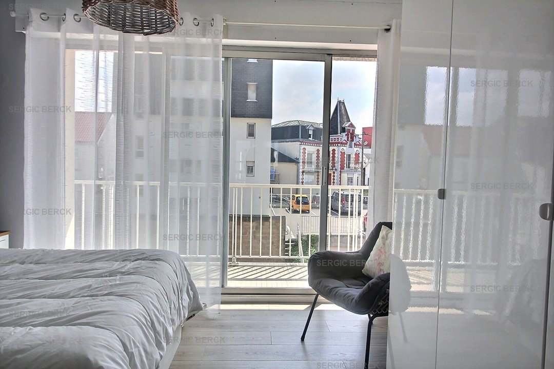 Entrée, cuisine équipée, chambre (lit double) avec balcon plein sud, wc indépendant, salle de bain, séjour avec balcon vue mer.