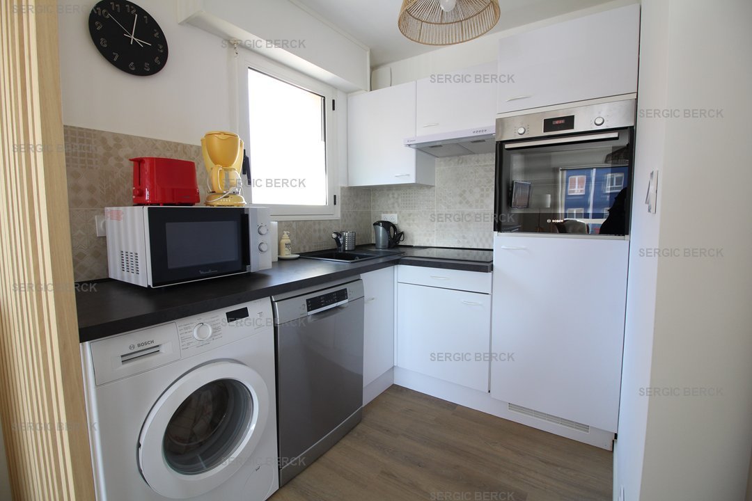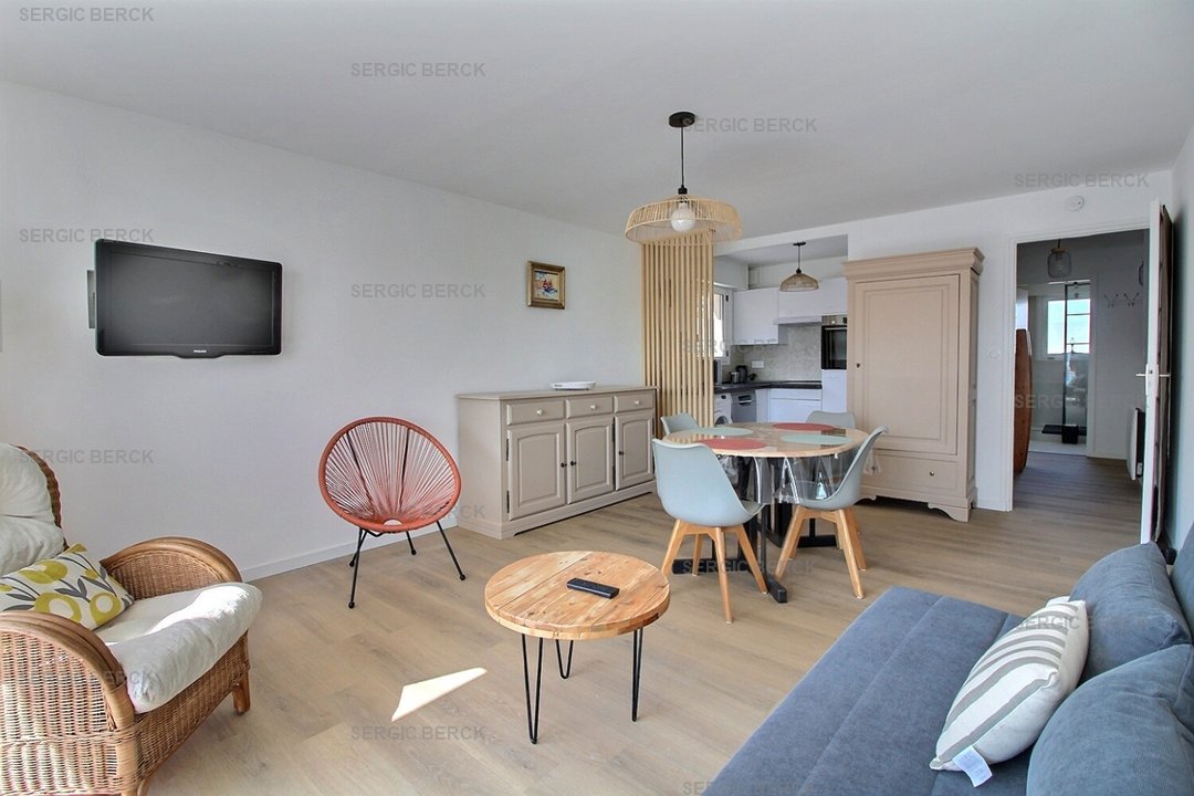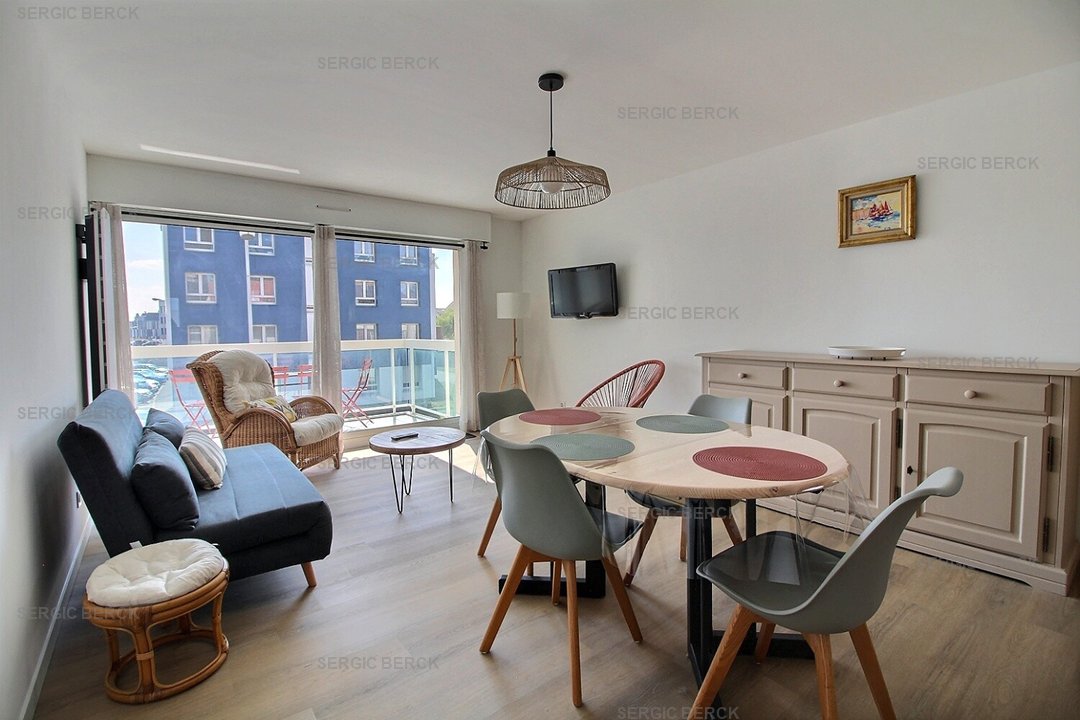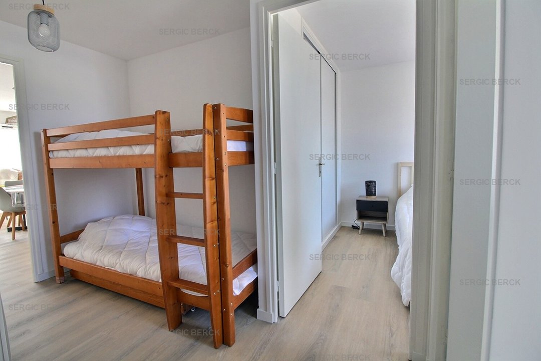 Bel appartement lumineux pour 4 personnes, au 1er étage d'un immeuble avec ascenseur, qui se compose d' une entrée, des wc, un coin nuit avec lit superposés pour 2 enfants (90), un beau séjour avec belle terrasse, une kitchenette équipée, une salle d'eau avec douche, le chauffage est électrique, Emplacement parking privé. Accès à un local vélo.