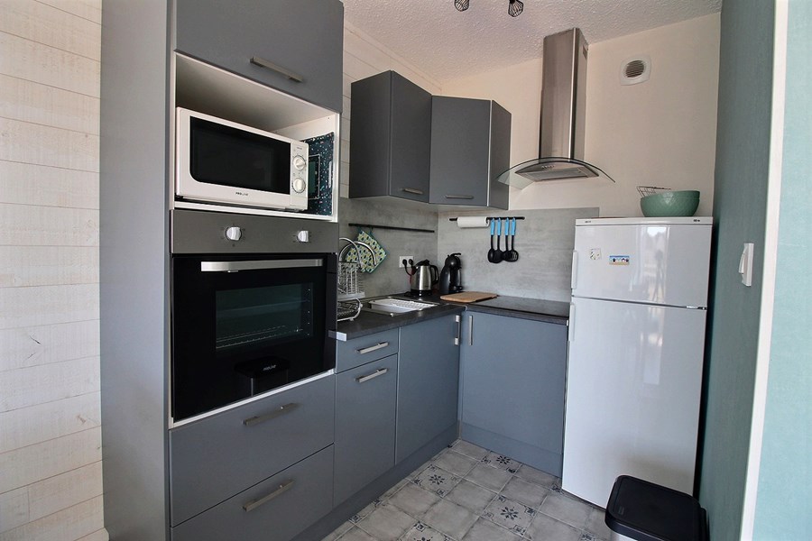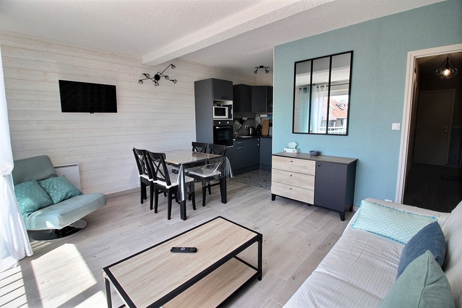 Séjour exposé Sud, et cuisine équipée ouverte sur le séjour.