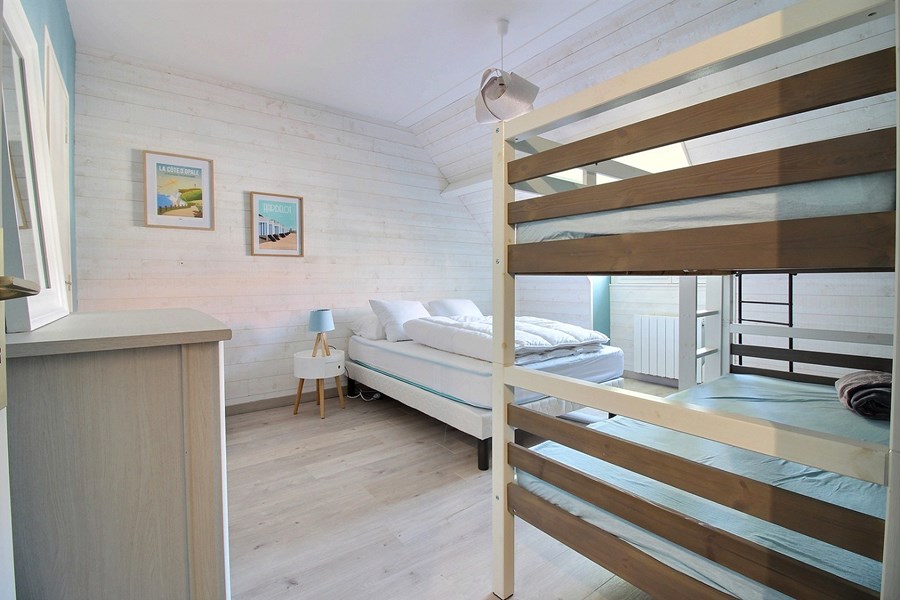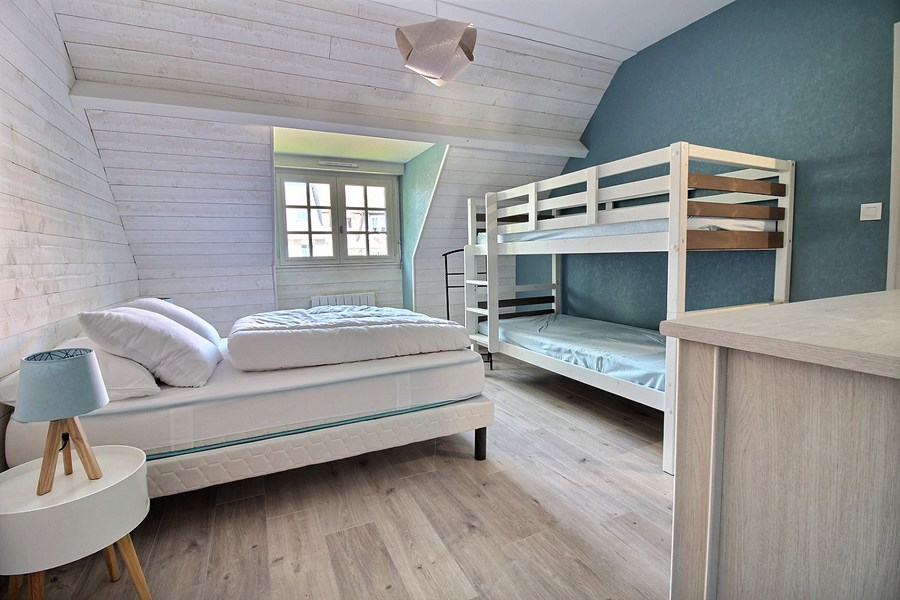 Une chambre avec un lit double en 140, et lits superposés en 90.