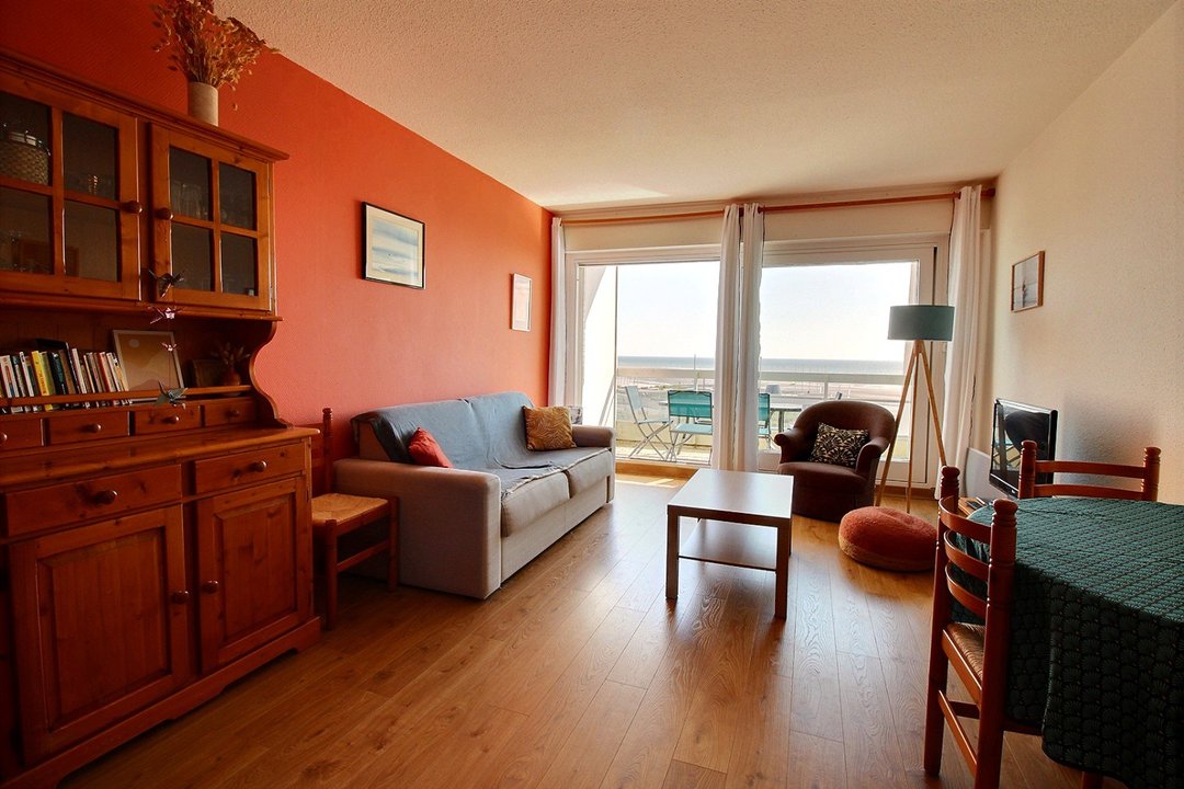 Salon/séjour avec cuisine ouverte, donnant sur un balcon exposé Sud/Ouest. Canapé convertible 140 dans le séjour.