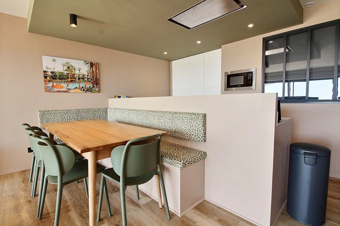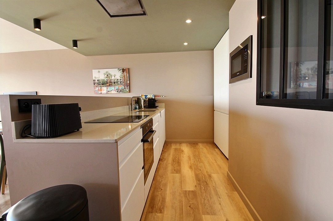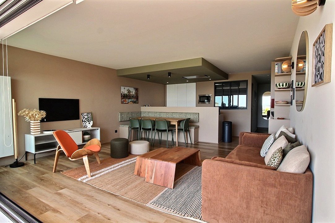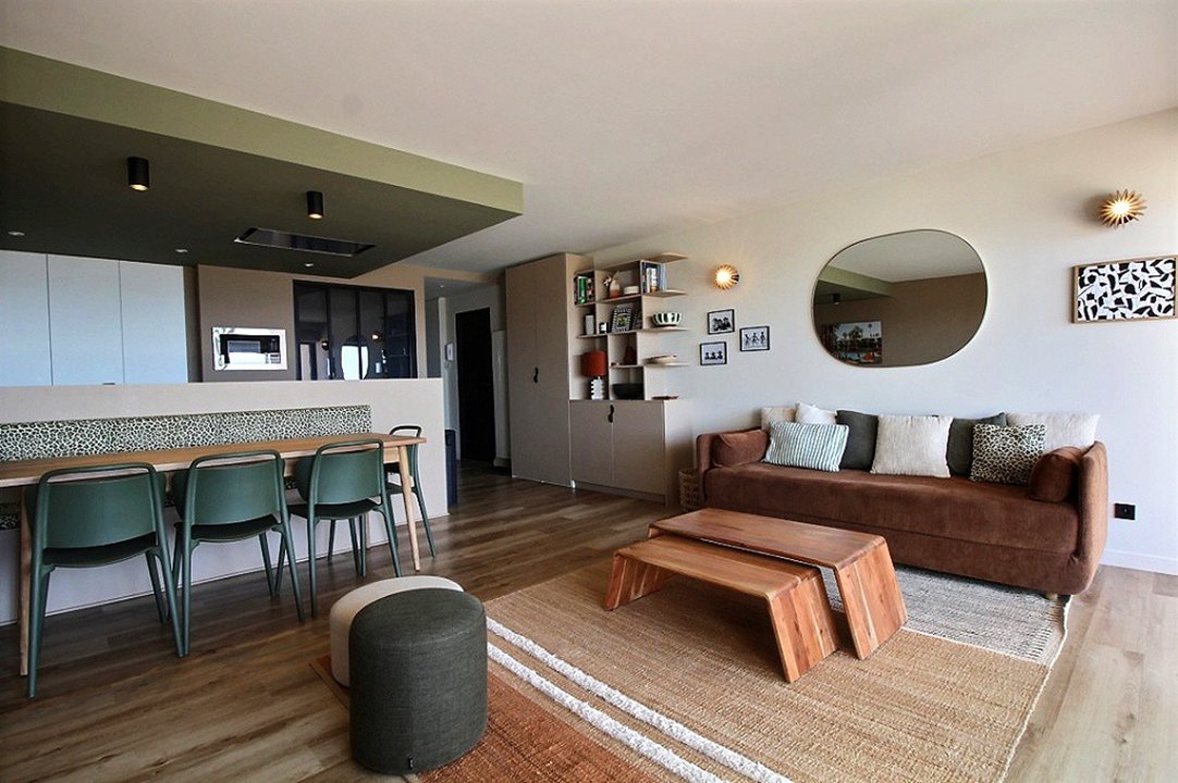 Agréable T3 traversant lumineux à la décoration soignée de 63m2 entièrement refait à neuf, bien équipé avec rez-de-jardin vue mer offrant : une grande pièce à vivre totalement ouverte, accueillant un salon lumineux ouvert sur une cuisine design et équipée.