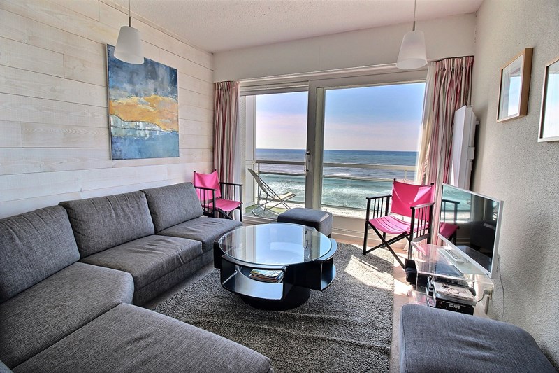 Salon/séjour avec balcon vue mer. Cuisine équipée.