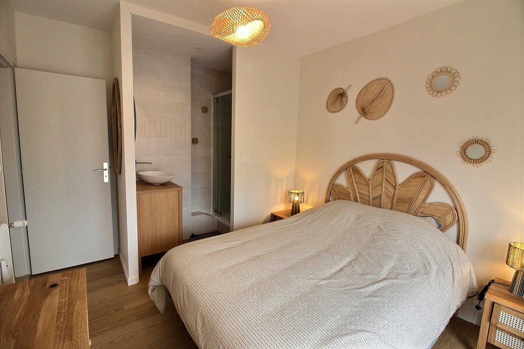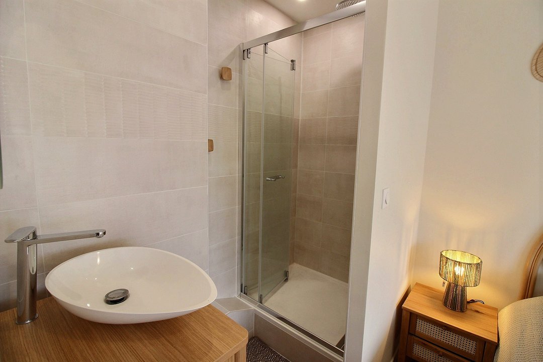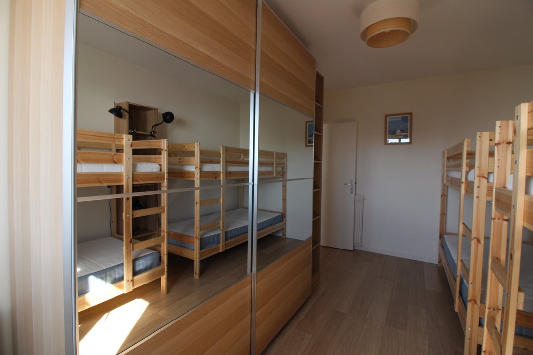 Une chambre avec 1 lit double en 160 et douche. Une deuxième chambre en 140 avec lit double. Et une 3ème chambre avec 2x2 lits superposés en 90.