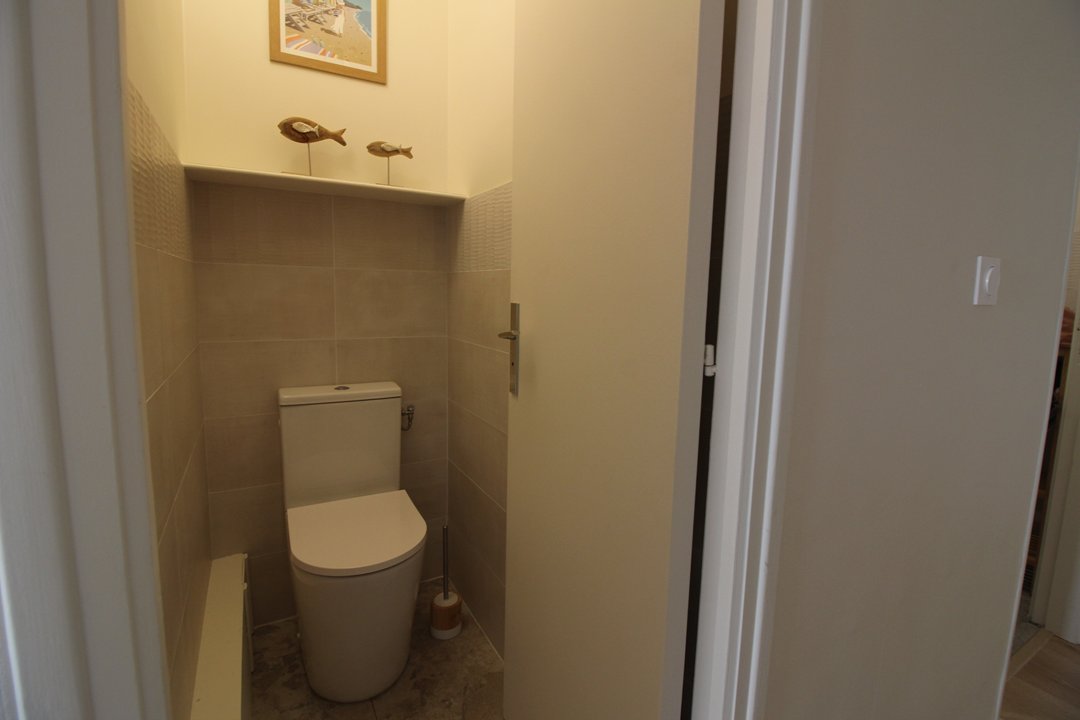 Salle de bain avec lave linge et WC séparé.