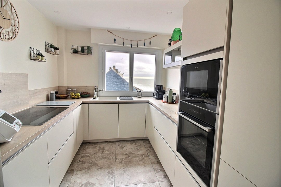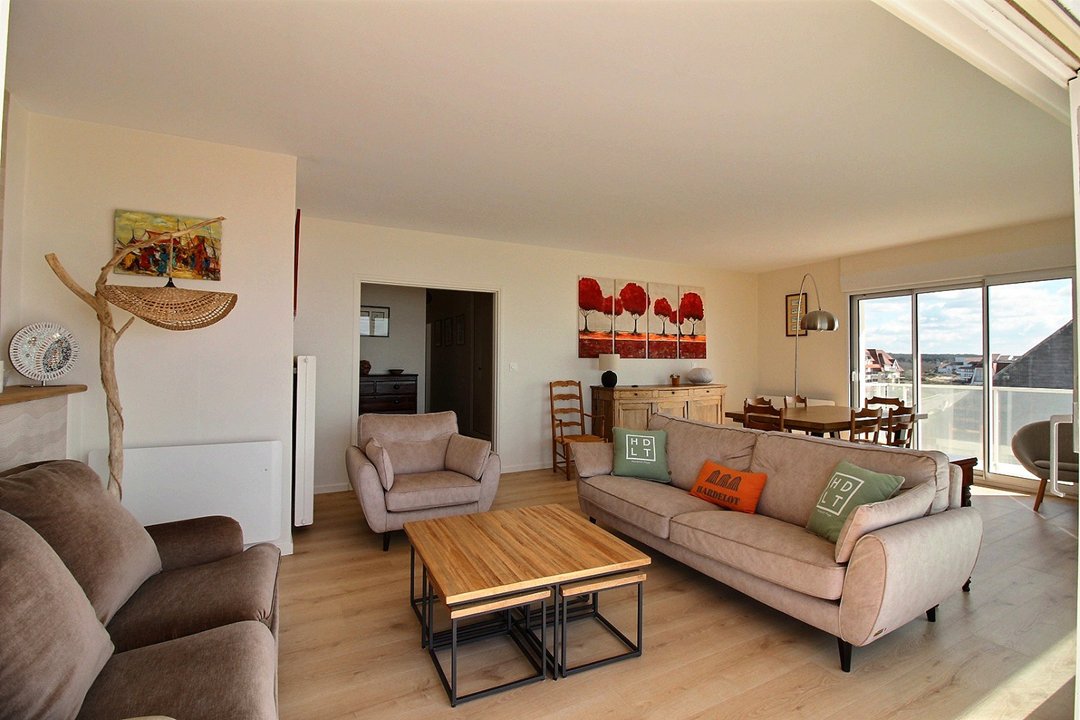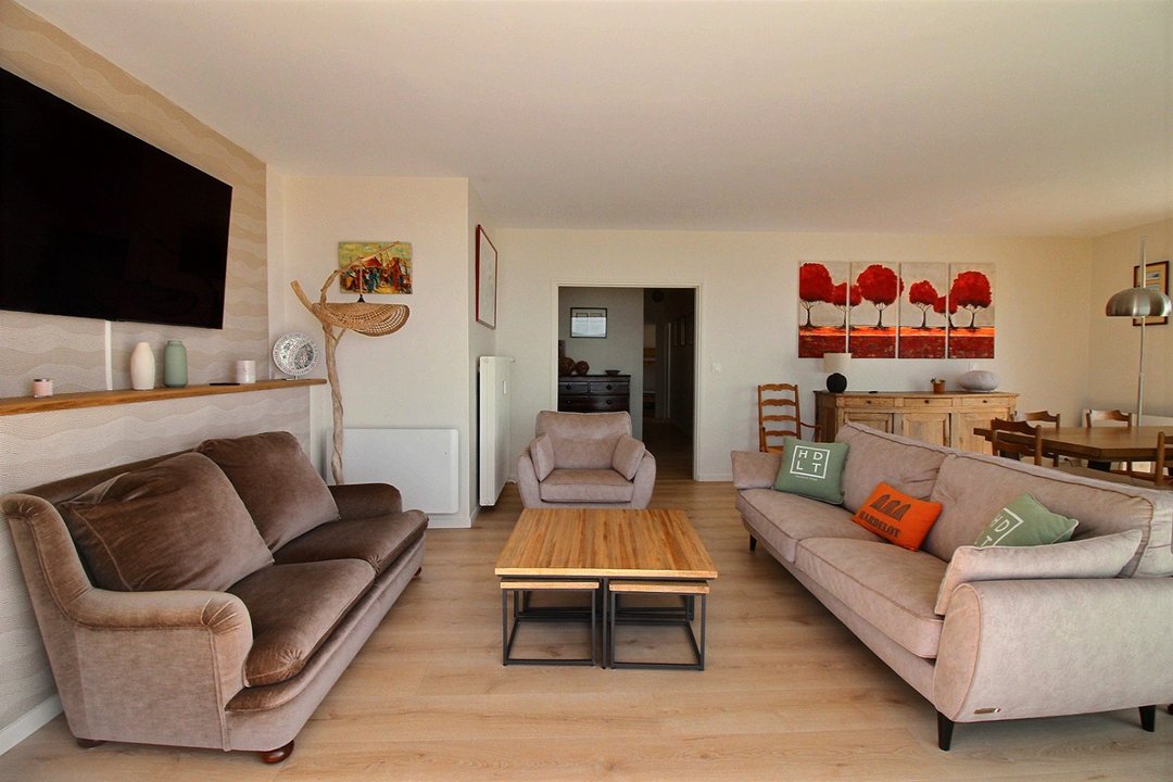 Salon/séjour avec balcon vue mer. Cuisine équipée.